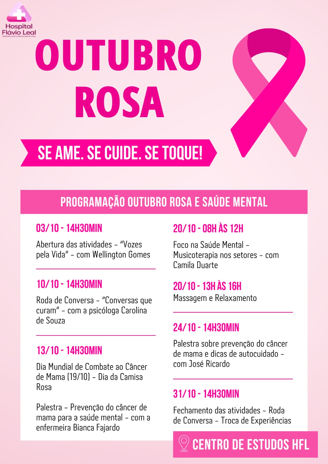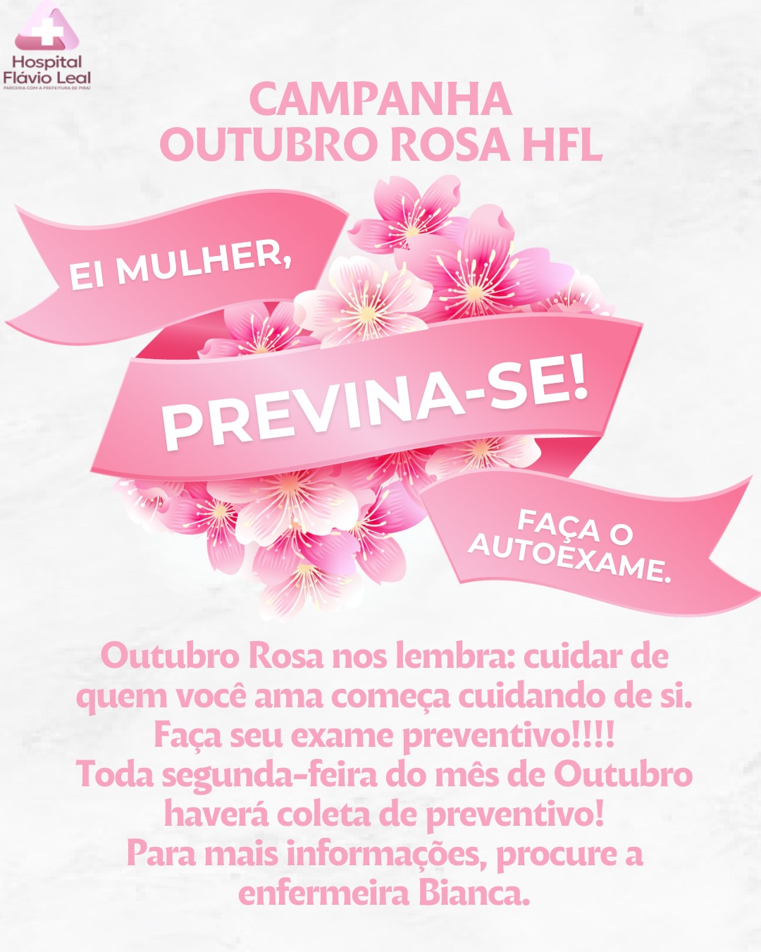 O Hospital Flávio Leal abraça mais uma vez a Campanha Outubro Rosa, movimento internacional que reforça a importância da prevenção e do diagnóstico precoce do câncer de mama. Este ano, a nossa ação vem com um olhar especial: o cuidado com quem cuida ?